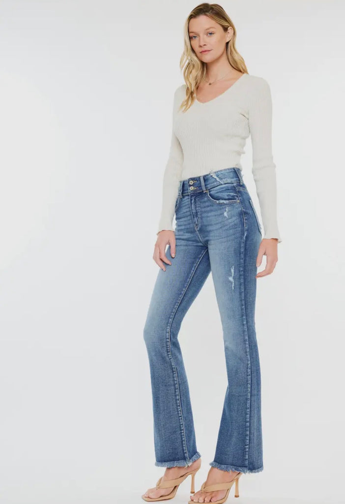 Classic meets modern in these ultra-flattering bootcut jeans! Featuring a high-rise double-button waist and light distressing, these jeans hug your curves in all the right places while giving that long-leg, timeless look. The frayed hem adds a touch of edge ā perfect for boots, heels, or sneakers. Rise 11 Inseam 32