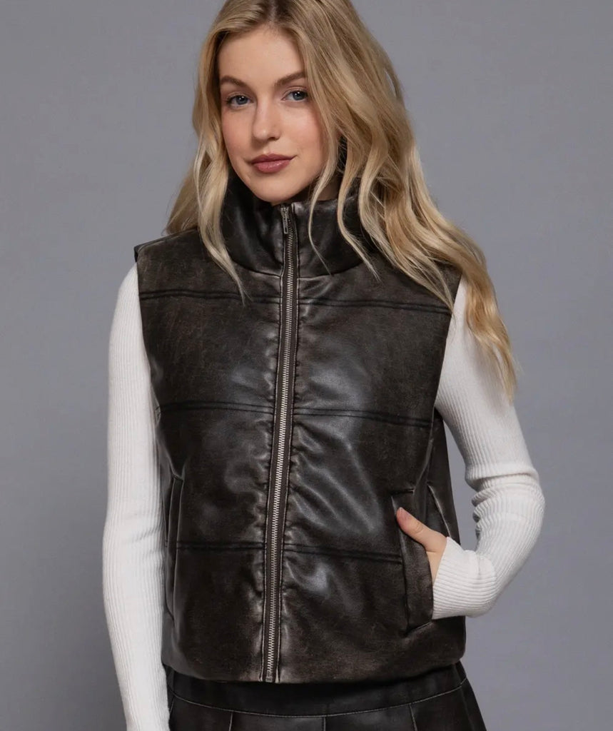 Stay warm and stylish this season with this sleek faux leather vest — the perfect blend of edgy and chic. Available in rich espresso brown and classic black, this vest adds instant attitude to your fall and winter looks. It’s soft, cozy, and just structured enough to give your outfit that on-trend polish.